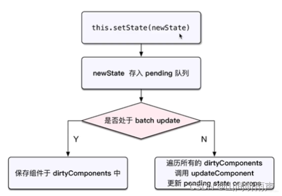 先来看下 setState 的主流程:依据 setState来设置新值,并将新值存入 pending 队列中后,判断是否处于 batch update ,如果处于,则把组件进行标记,并存入 dirtyComponents 中,即先保存后更新(异步),不处于的话,就直接遍历所有 dirtyComponents 组件,调用更新,即直接遍历然后更新(同步)。
