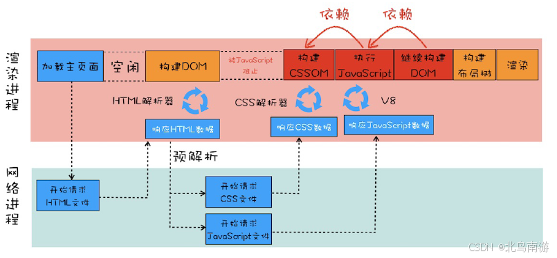 在执行 JavaScript 脚本之前,如果页面中包含了外部 CSS 文件的引用,或者通过 style 标签内置了 CSS 内容,那么渲染引擎还需要将这些内容转化为 CSSOM,因为 JavaScript 有修改 CSSOM 的能力,所以在执行 JavaScript 之前,还需要依赖 CSSOM。也就是说 CSS 在部分情况下也会阻塞 DOM 的生成。