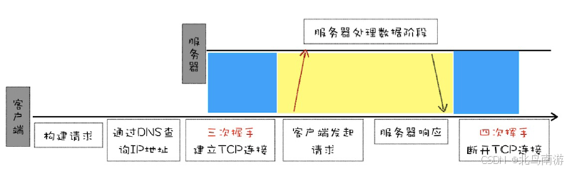 发送 HTTP 请求。建立 TCP 连接后,浏览器就可以和服务器进行 HTTP 数据传输了,首先会向服务器发送请求行,然后以请求头形式发送一些其他信息,如果是 POST 请求还会发送请求体;