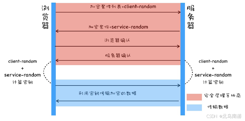 对称加密:浏览器发送加密套件列表和一个随机数 client-random,服务器会从加密套件中选取一个加密套件,然后生成一个随机数 service-random,返回给浏览器。这样浏览器和服务器都有相同 client-random 和 service-random,再用相同的方法将两者混合生成一个密钥 master secret,双方就可以进行数据加密传输了;