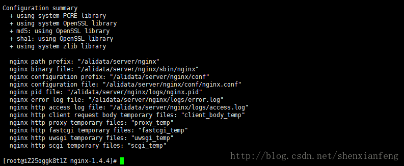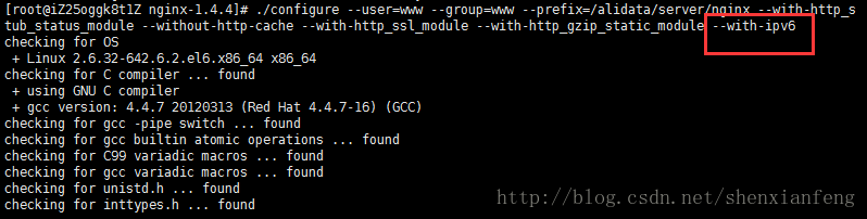 [root@iz2ze3oyrjbxg32wecre15z/]#./configure --user=www --group=www --prefix=/alidata/server/nginx --with-http_stub_status_module --without-http-cache --with-http_ssl_module --with-http_gzip_static_module --with-ipv6