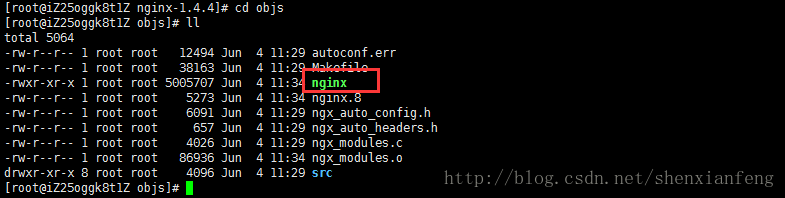 4、 编译完毕后,会在当前目录下创建objs目录,新的nginx执行文件将生成在该目录中