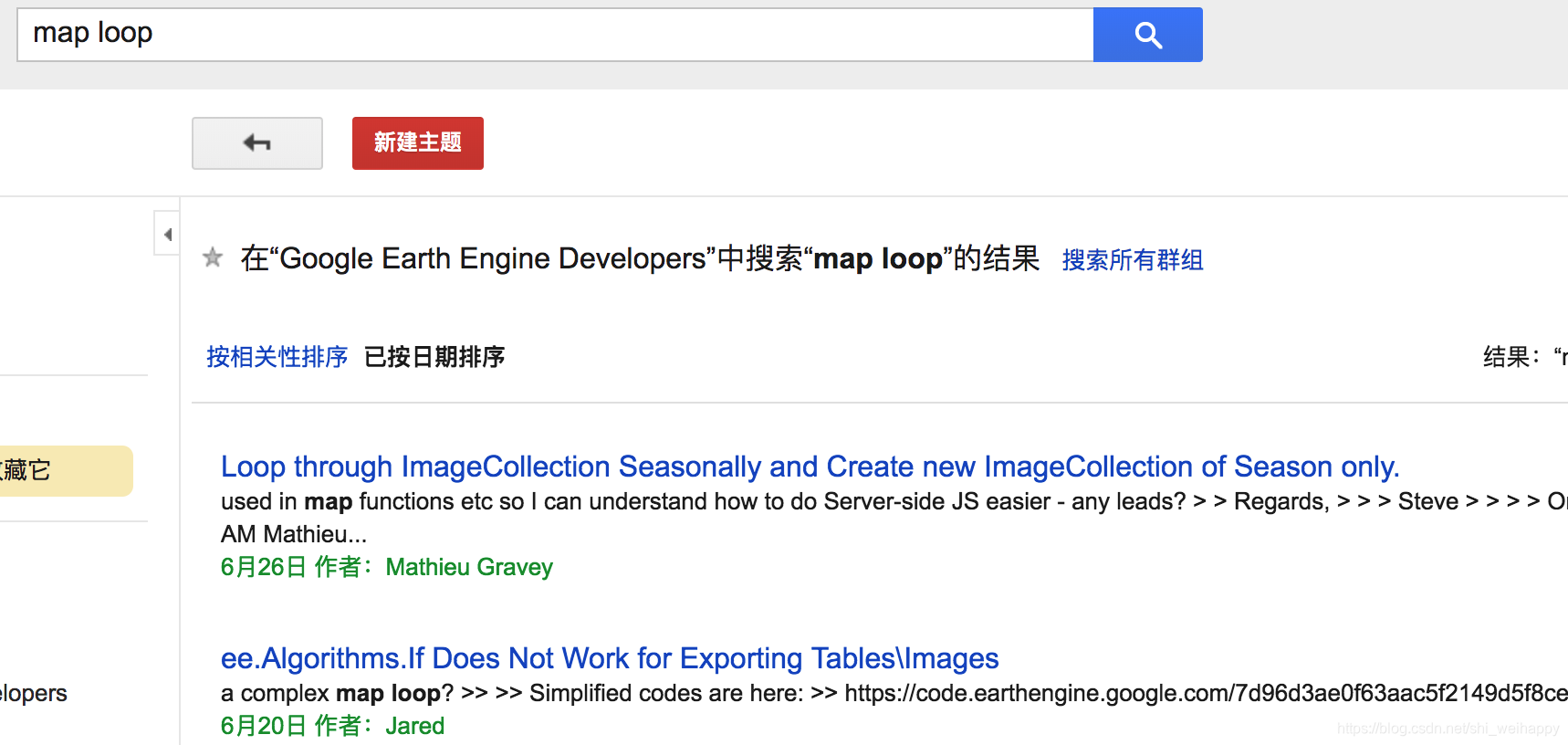 类似这种我们我们可以直接到官方文档中查看相关例子,或者到论坛中查找(https://groups.google.com/forum/#!forum/google-earth-engine-developers)。就以这个为例,我们在搜索框输入map loop这种关键字,那么就可以搜索GEE论坛的相关帖子。