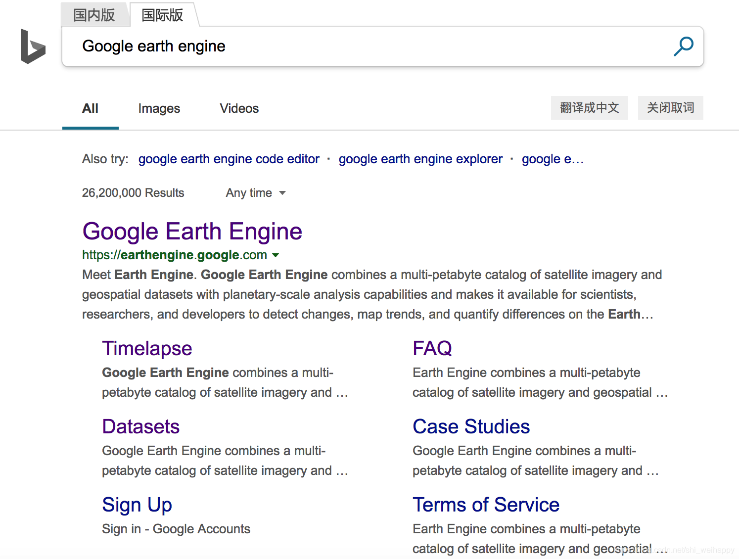 我们学习新的知识内容来源可能有很多,比如老师讲解、朋友介绍、看书籍查资料看到等等,无论哪种途径其实我们可以对我们要了解学习的内容有一个大概的了解。比如这个知识是做什么的、官方名字叫什么、去哪里可以查找到之类的。以GEE为例,当我们第一次听说它的时候,可能我们会问这是什么东西?全名叫什么?官方地址是什么?别人可能会告诉你GEE的全称叫做Google Earth Engine,是用来做遥感图像处理的在线工具,是Google做的。剩下的东西可能就需要我们自己搜索,比如使用不同引擎: