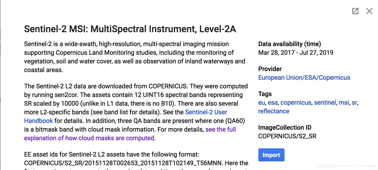 依次点开查看,我们发现Level-2A就是我们想要找的数据。遇到我们不熟悉的数据我们要善于利用搜索,包括GEE内部的搜索还是Google搜索等。