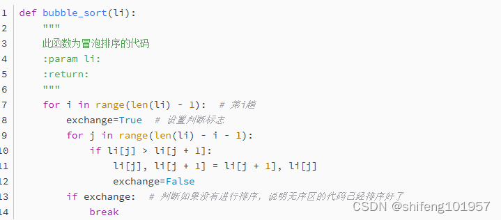 大家能够在我的代码当中看到,我设置了exchange这个参数,这个参数的含义就是,在一轮的交换当中,只要交换了位置,我就将exchange这个参数令为False,在后方就不会跳出for循环,说明还有数据不是排序好的,只要我们在一轮交换数据中第一个是4和2比较,4大于2,所以4和2交换位置。