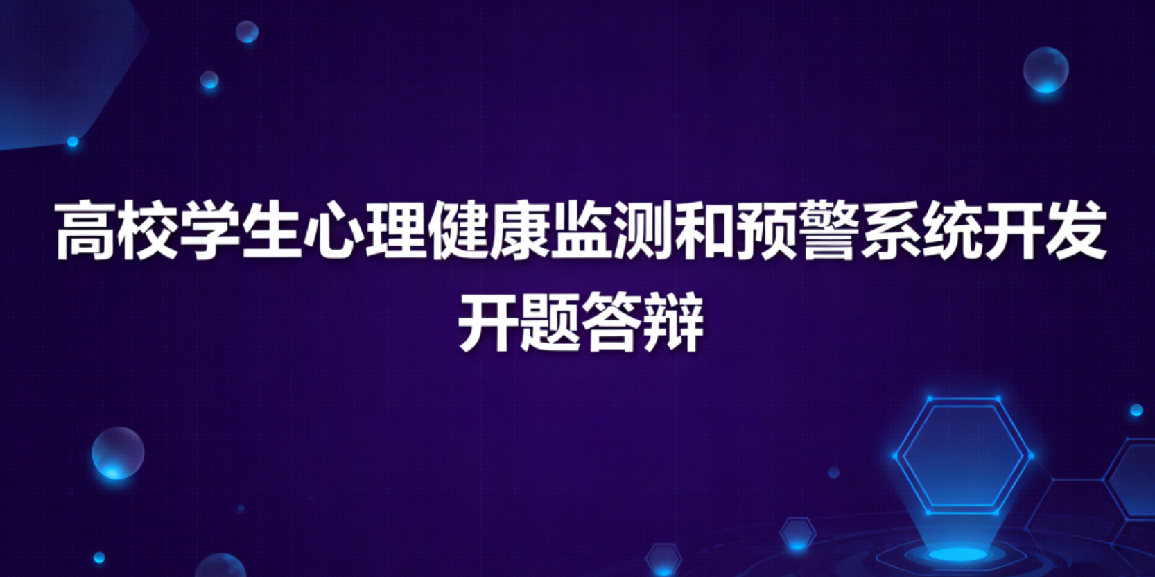 “各位老师好,我是xx同学,我的题目是《高校学生心理健康监测与预警系统的设计与实现》。系统面向学生、心理老师和管理员三类用户,主要功能有:学生在线测评、个性化建议、预约咨询;老师查看档案、在线回复、制定干预方案;管理员做数据大屏、预警规则和账号管理。技术栈选的是最常规的:前端 HTML+CSS+JS(Bootstrap),后端 Java(SpringBoot),数据库 MySQL,预警用简单的阈值判断,图表用 ECharts 展示。下面请各位老师提问。”