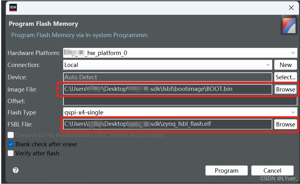 - 选择BOOT.bin文件和zynq_fsbl_flash.elf文件的路径,如下图,选择完成后点击Program。此时文件开始烧写,烧写完成后重新上电,完成程序固化。