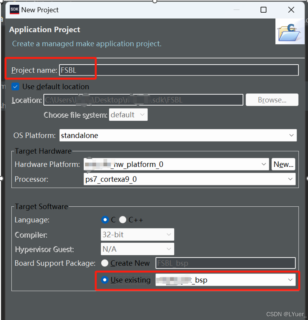弹窗中命名为“FSBL”,并选择“use existing”,点击next,选择“Zynq FSBL”,Finish.