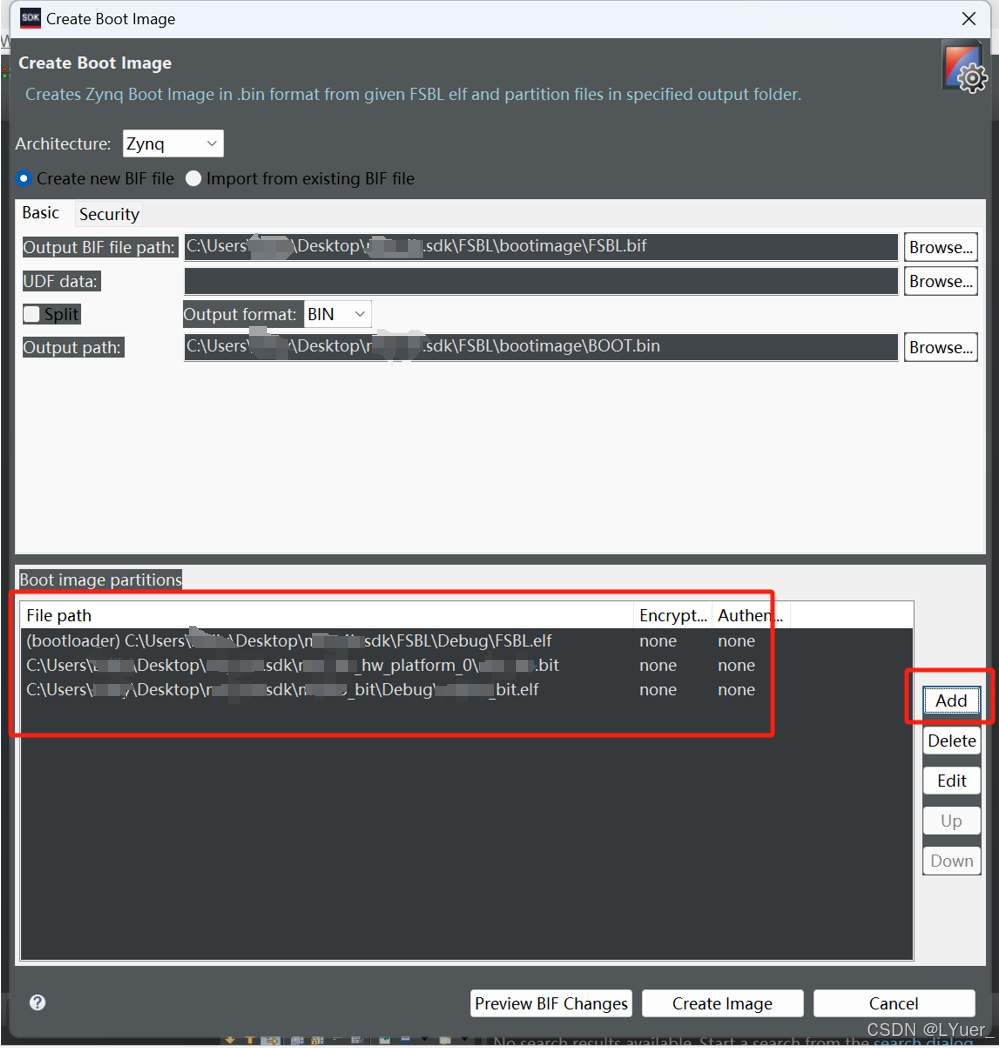 - 点击ADD,弹出窗口中选择路径,将fsbl.elf、bit.elf、xx.bit添加进去