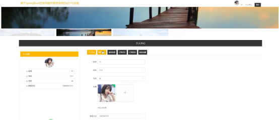 个人中心:在个人中心页面通过填写个人详细信息进行更新操作,还可以对服务预约、接单信息、订单评价、订单投诉、我的收藏进行详细操作;如图5-5所示: