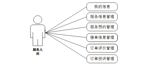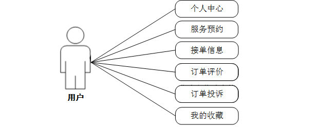 (3)用户关键功能包含个人中心、服务预约、接单信息、订单评价、订单投诉、我的收藏等进行管理。用户用例如下: