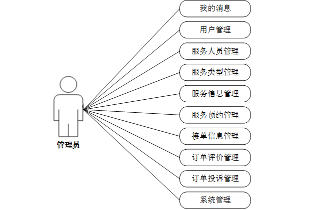(1)管理员关键功能包含我的消息、用户管理、服务人员管理、服务类型管理、服务信息管理、服务预约管理、接单信息管理、订单评价管理、订单投诉管理、系统管理等进行管理。管理员用例如下: