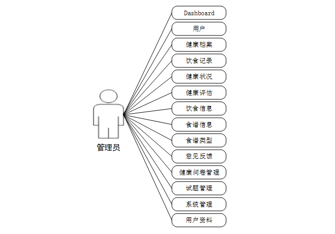 (1)、管理员关键功能包含对Dashboard,用户,健康档案,饮食记录,健康状况,健康评估,饮食信息,食谱信息,食谱类型,意见反馈,健康问卷管理,试题管理,系统管理,用户资料等进行管理。管理员用例图如下: