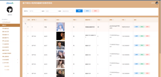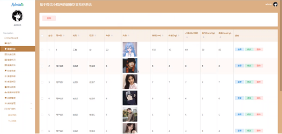 (1)功能要求:管理人员可以对Dashboard,用户,健康档案,饮食记录,健康状况,健康评估,饮食信息,食谱信息,食谱类型,意见反馈,健康问卷管理,试题管理,系统管理,用户资料等功能进行管理。