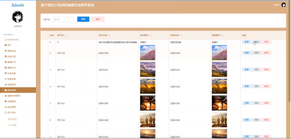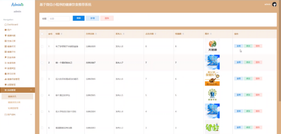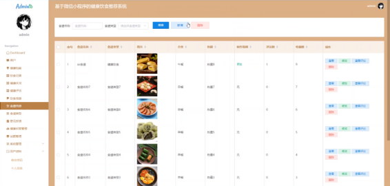 管理员点击食谱信息。在食谱信息界面输入食谱名称和选择食谱类型进行搜索、新增或删除食谱信息列表,并根据需要对食谱详情信息进行查看、修改、查看评论或删除操作;如图5-11所示。