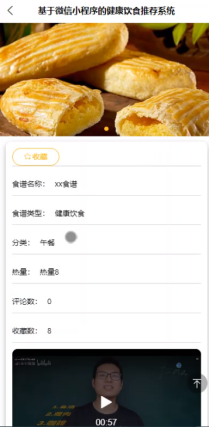 食谱信息:在食谱信息界面可以查看到食谱名称、食谱类型、分类、热量、评论数、收藏数、食材、食谱详情等信息,并根据需要进行评论或收藏操作。食谱信息详情如图5-4所示。
