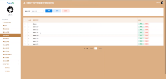 管理员点击健康状况。在健康状况界面输入健康状况进行搜索、新增或删除健康状况列表,并根据需要对健康状况详情信息进行修改或删除操作;如图5-10所示。