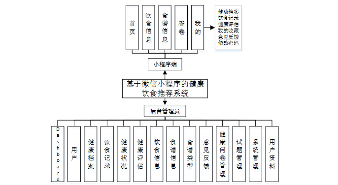 管理员模块属于是网站的后台,进入之后有大量的管理员功能,管理员也可以使用用户模块的功能,为了维护网站的稳定与页面的布局,将管理员模块的功能详细化后可以使用系统管理对页面进行布局修改。用户模块只可以修改个人信息,对健康档案,饮食记录,健康评估,我的收藏,意见反馈,修改密码等进行操作,健康饮食推荐系统总体结构图如图4-2所示。