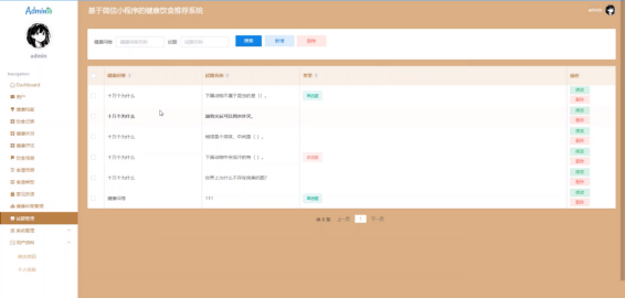 管理员点击试题管理。在试题管理界面输入健康问卷和试题进行搜索、新增或删除试题管理列表,并根据需要对试题管理详情信息进行修改或删除操作;如图5-13所示。