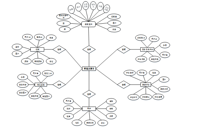 E-R图(Entity Relationship Diagram)是指用来表现数据库中实现实际世界建模的数据库概念模型。本系统将“健康资讯、收藏、饮食信息评论、用户、意见反馈、健康评估”等作为实体,它们的局部E-R图,如图4-3所示: