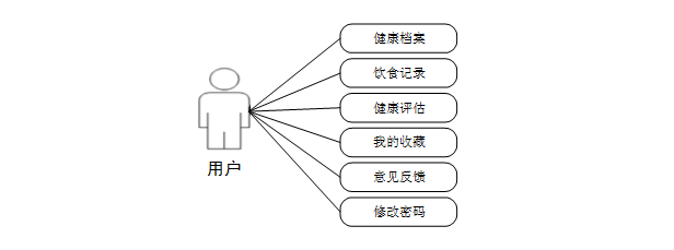 (2)、用户关键功能包含对健康档案,饮食记录,健康评估,我的收藏,意见反馈,修改密码等进行管理。用户用例图如下: