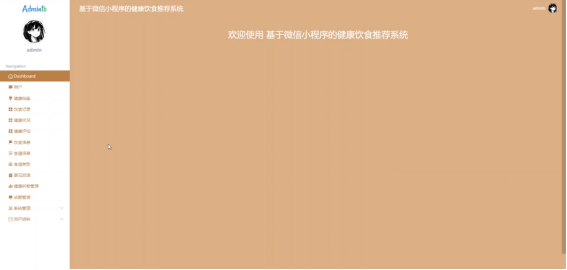 管理员登录进入小程序可以对Dashboard,用户,健康档案,饮食记录,健康状况,健康评估,饮食信息,食谱信息,食谱类型,意见反馈,健康问卷管理,试题管理,系统管理,用户资料等功能进行详细操作,管理员主界面如图5-7所示。