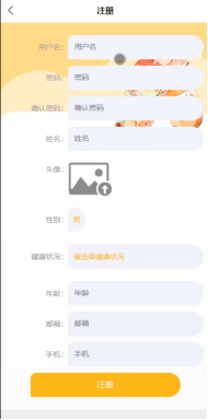 用户:注册/登录、找回密码、头像、性别、年龄、邮箱、手机、健康状况标签