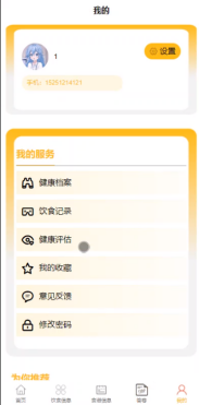 用户登录成功后,点击“我的”进入我的页面,在我的页面可以对健康档案,饮食记录,健康评估,我的收藏,意见反馈,修改密码等进行详细操作。用户功能界面如图5-5所示。
