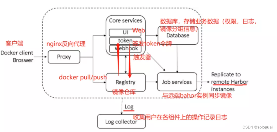 | Job services | 主要用于镜像复制,本地镜像可以被同步到远程 Harbor 实例上。 |