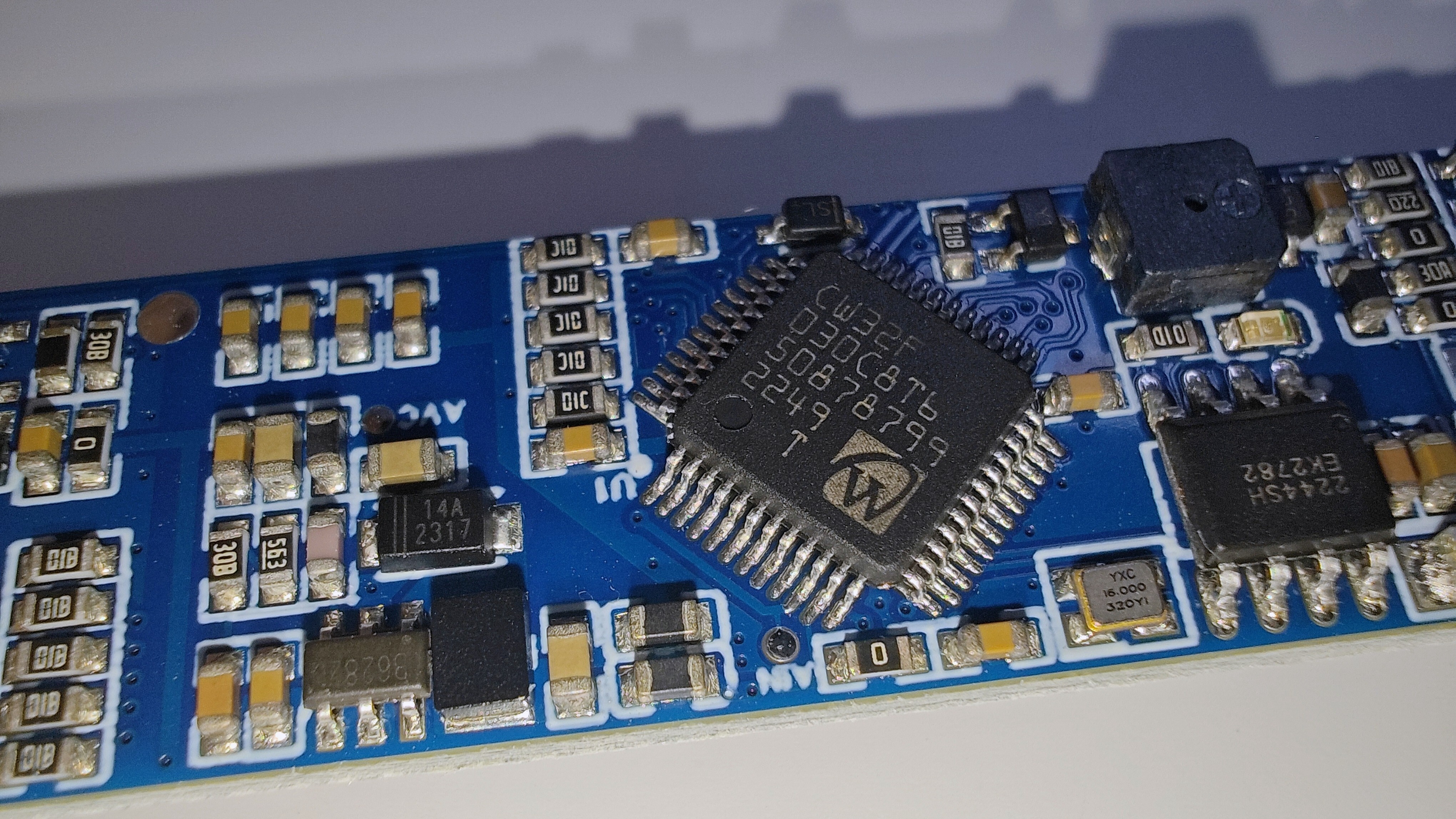 本项目不使用bootloader烧录,因此BOOT引脚直接拉低(标准画法可以参考被注释的部分,本项目的PCB面积较为紧张,就直接接地了)。SWD接口为PA13、PA14,本项目中通过1.0间距的排针引出,不过在实际使用中不需要焊接排针,只需要使用探针(项目工程里有探针的转接板)顶住接口就可以进行下载。排针引出接口包括SWD、RST、MCUVCC等,方便进行调试(PCB上的复位按键不能SMT焊接,因为贴片焊盘和排针直插焊盘复用,回流焊会漏锡造成虚焊甚至短路!复位按键的设计是为了在烧录完成后,确定不会再烧录的情况下焊接,既可以挡住排针的孔(没错,我有强迫症),也可以当作复位按键使用(仿佛说了一句废话),即使不焊接也可以使用镊子等金属物品短接RST和GND孔洞进行复位操作。
