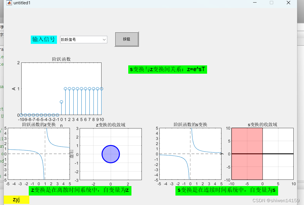 通过 GUI 动态展示 z 变换与 s 变换之间的所有关系 使用matlab的GUI 动态展示 z 变换与 s 变换之间的所有关系。要求z变换与s变换的关系,首先考虑z变换与s变换之间运用领域的不同,s域是连续时间表示域,使用连续的时间变量s表示信号的自变量,取值范围为复平面上的所有点。而z域是离散时间表示域,使用离散的时间变量z表示信号的 自变量取值范围虽然也为复平面上的所有点,但对于离散信号而言,主要在单位圆内取值。首先设置一个列表框,列出输入信号,这里我设置了一个阶跃信号一个冲激信号,之后设置一个按钮与五个轴,在第一个轴中运用heaviside与。