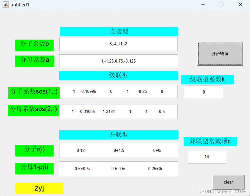 MATLAB实现IIR低通滤波器 要实现IIR滤波器三种形式的转换,只需借用matlab中内置的函数,如tf2sos函数即可将直接型转换为级联型,sos2tf可将级联型转换为直接型,而residuez函数可实现直接型与并联型间的互相转换。直接型分式上面是b(i)*z(-i)i从0开始,下面是a(i)*z(-i)i从0开始,所以只需输入系数向量即可表示直接型iir滤波器的系统函数,所以设定两个可编辑文本框,其中输入要求的系统函数的系数矩阵。
