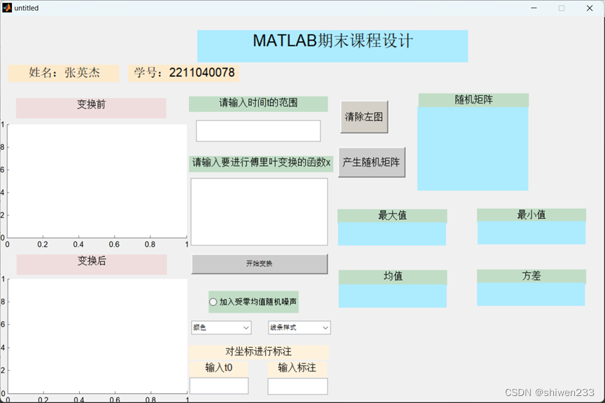 matlab傅里叶变换及矩阵数据统计 1)在设计这一部分的时候,我首先的思路是在轴中的回调函数中调用可编辑文本框中的内容来完成绘图。接着判断edit3与edit4中是否有值,有值则将edit3赋给t,此时t即为要标注的点,将t代入函数x得到对应的值,这样标注的坐标即可求得,然后接收edit4中标注的内容,用text函数将其在两个轴中标注出来并设置标注的样式,接下来我想要把标注坐标对应的点特别表示出来,于是用了plot函数将这个坐标用×标志表示出来,然后又觉得标志与标注间离得太近,于是加了一个\leftarrow来生成左箭头。