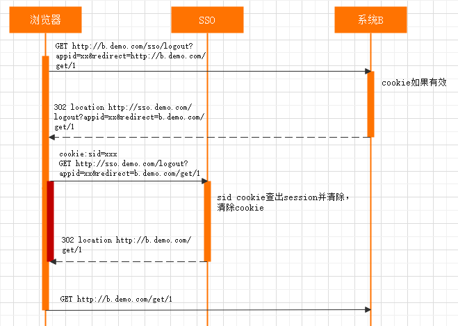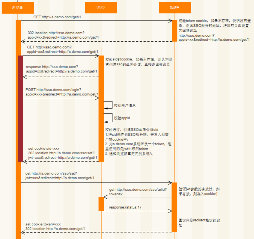 在这个过程中关键在于第一次重定向的时候,它会把sso.demo.com这个域名下的sid带给sso服务;