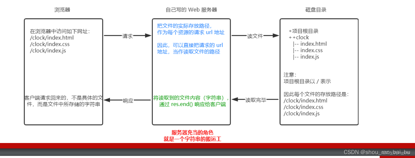只要服务器接收到了客户端的请求,就会调用通过 server.on() 为服务器绑定的 request 事件处理函数。