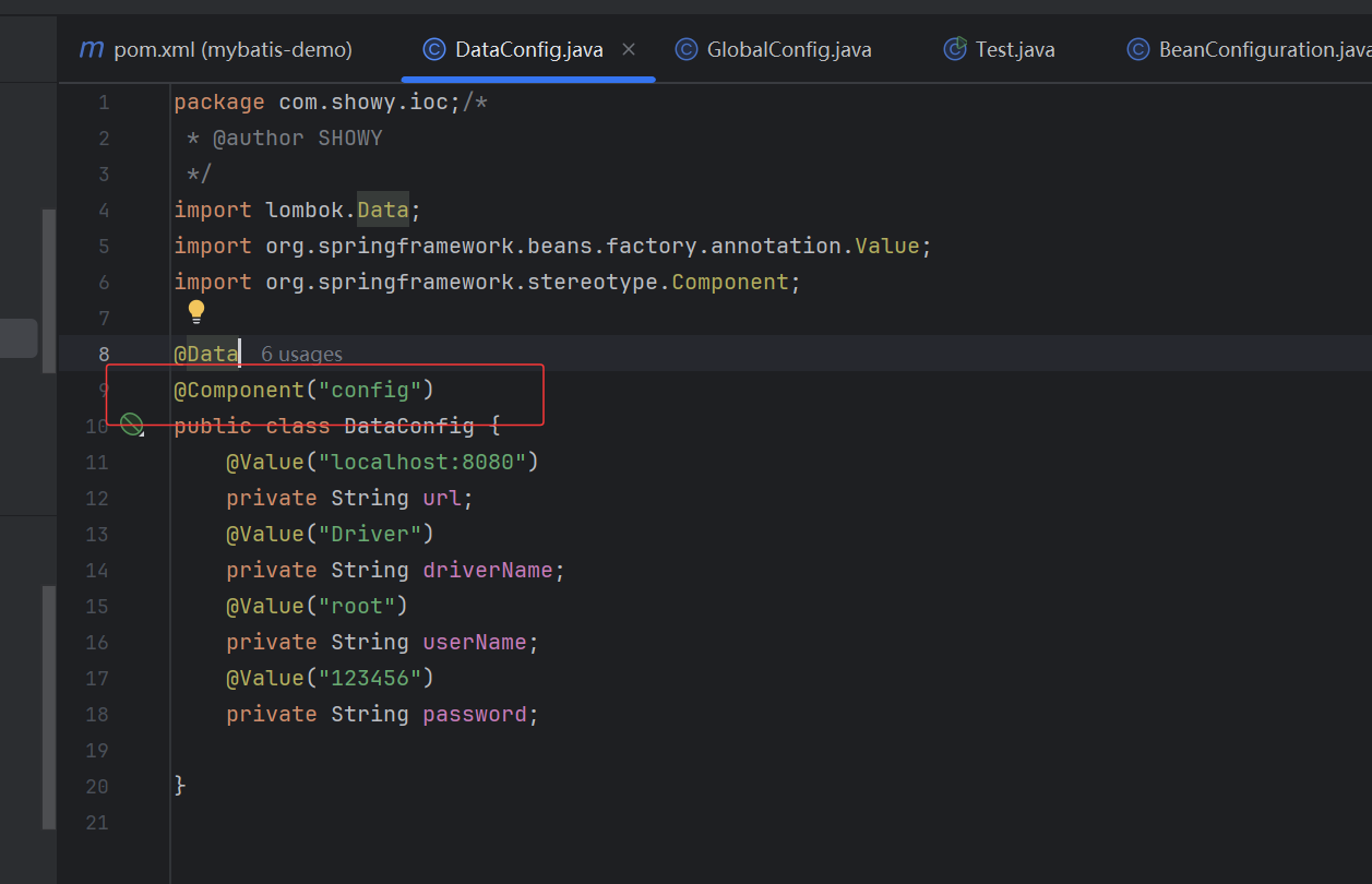 <bean class="com.showy.ioc.DataConfig" id="config">