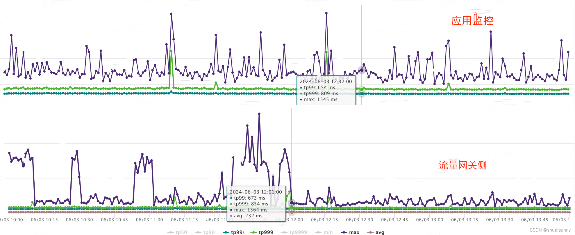 最近在进行线上监控检查时,我遇到了两个超出预期的案例。首先,网关层的监控数据与应用实际监控数据存在不一致性,尤其是max有较大的差异,详见如下图。其次在某个应用中,通过httpclient请求某域名时发现只有一台机器持续出现"Read timed out"的异常错误。