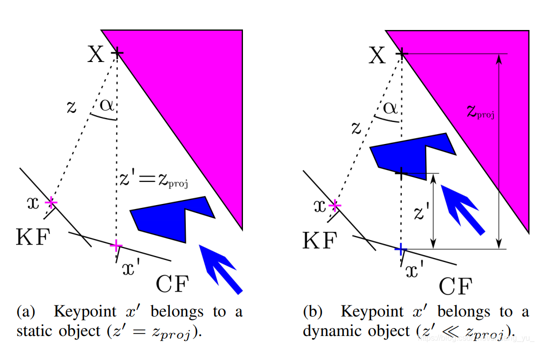 α,如果该角度大于30°,我们认为该点可能被遮挡,此后将会被忽略。而在TUM数据库中,对于大于30°视差角的静态对象将会被认为为动态对象。考虑投影深度