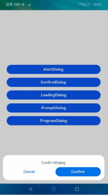 界面主要包括按钮列表页和自定义弹窗两部分,我们可以通过在dialog标签中添加自定义组件设置弹窗,具体效果如图所示: