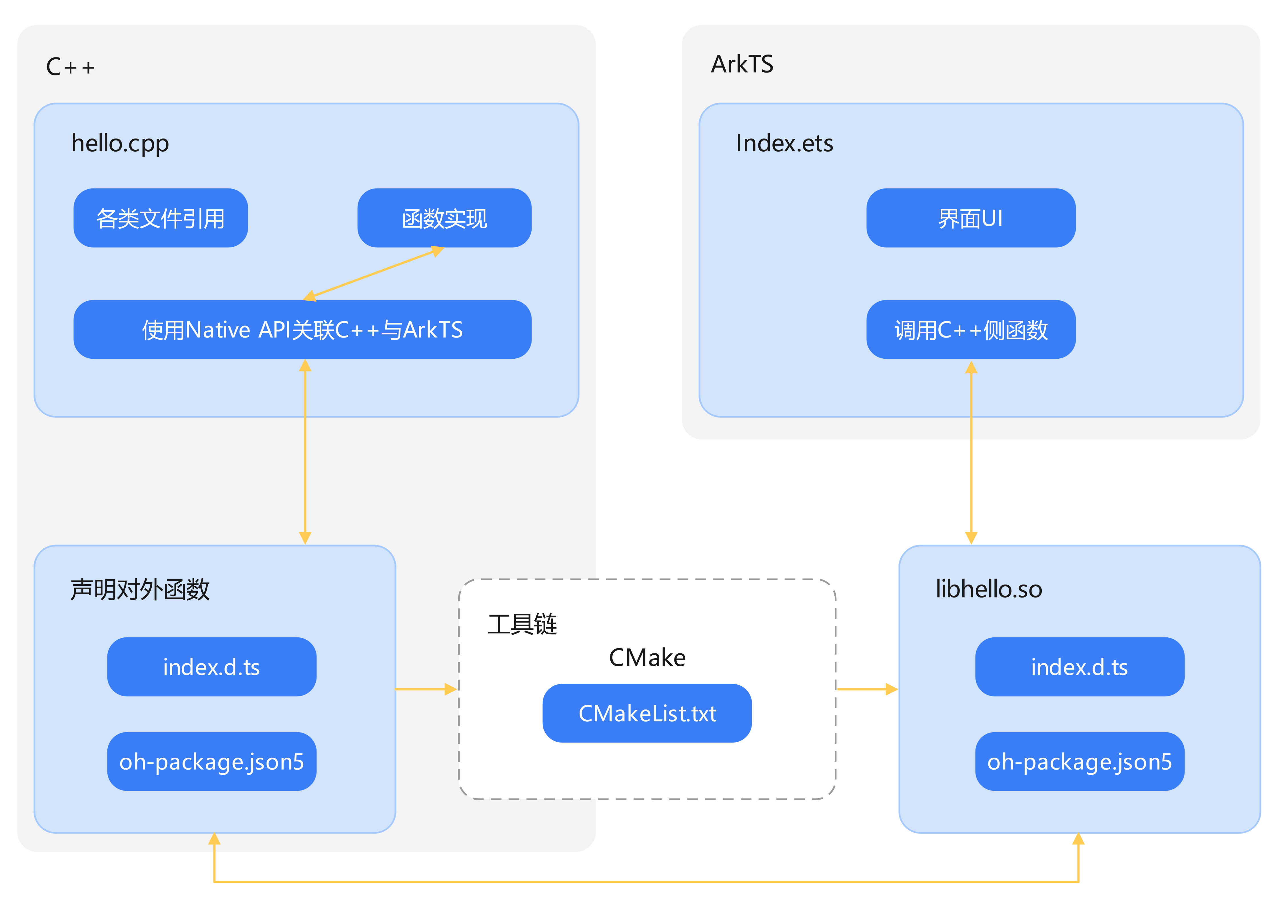 示意图中,hello.cpp文件实现C++方法,并通过NAPI将C++方法与ArkTS方法关联。