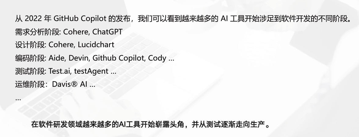 随着技术不断进步,大语言模型(LLM)的出现如同在研发领域投下一颗重磅炸弹。LLM通过海量数据训练,掌握了强大自然语言处理和生成能力,使其在软件研发过程中独具一格。从需求分析到设计,再到编码、测试和运维,LLM几乎涉足了软件开发的每一个环节。2022年GitHub Copilot的发布,将LLM的潜力推向了新的高度,吸引了众多开发者和企业的关注。