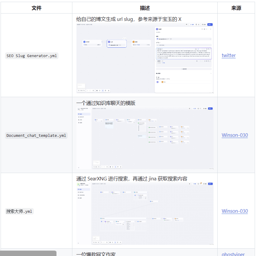比如,"SEO Slug Generator.yml"可以为博文生成优化的URL slug,提升搜索引擎的友好度。"Document_chat_template.yml"则是一个通过知识库进行聊天的模版,适用于各种客服或知识问答场景。