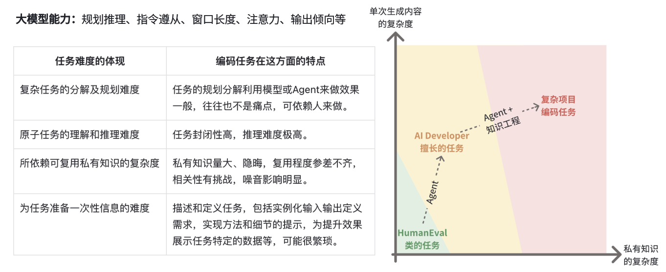 在实际开发过程中,任务的难度不仅取决于大模型的能力,如规划推理、指令遵从、窗口长度、注意力和输出倾向等,还涉及到单次生成内容的复杂度和编码任务的特点。