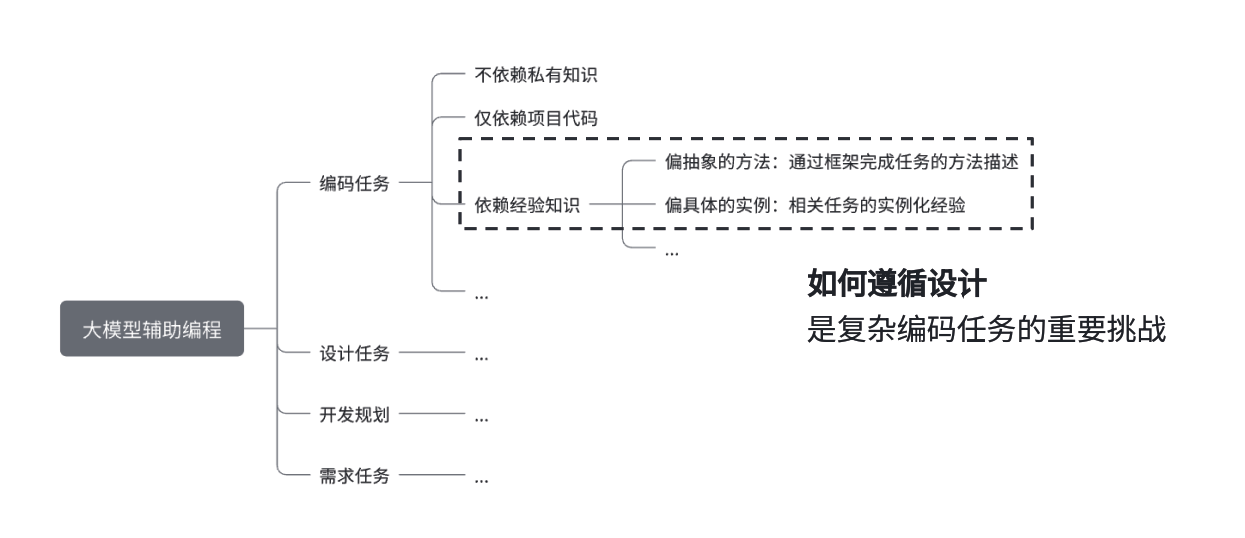 大模型辅助编程领域涵盖了编码任务、设计任务、开发规划和需求任务,这些任务分别关注于实现功能、系统架构、项目计划和需求分析。