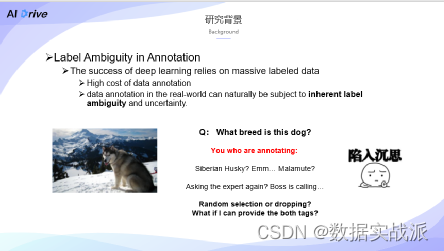 此时,如果你是一个一直养狗的人,是一个狗类专家,那么你可能一眼就辨识出来其种属。但是,如果像是这种从未养过狗,并且对其领域知识掌握不充分的人,可能就没有办法判别出。此时,若我一定要确认这只狗的种属,就不得不去查找相关文献,或者咨询专家。但是就会费功夫,那么该怎么办?比如随机选一个,但是阿拉斯加和哈士奇里面却选错了,在这种情况下,对于模型和数据,就引入了噪声的标签,实际上会对模型的准确性造成非常大的影响。