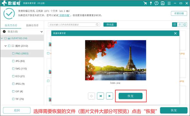 步骤5找到需要恢复的那个文件(若为图片文件大部分可预览),选择完毕点击“恢复”,可自由选择该文件的栖身之处(位置)。