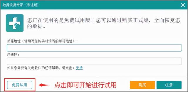 步骤2:打开之后,该软件会弹出一个小界面提示你注册,这个软件好就好在可以直接跳过不解风情的注册过程直接试用,我们点击“免费试用”;