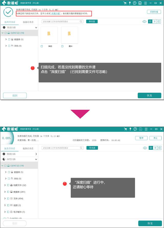 步骤4:扫描完成后你可能会发现其实有部分文件没有找到,那是因为该软件的机制为优先扫描时间最近的丢失文件,也就是时间差。不妨使用“深度扫描”(已找到文件的小伙伴可忽略),不用多说大家也知道“深度扫描”类似杀毒软件的全盘查杀吧!所以用时会稍微长一点,当然也根据你的文件数量或者大小等因素挂钩;