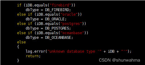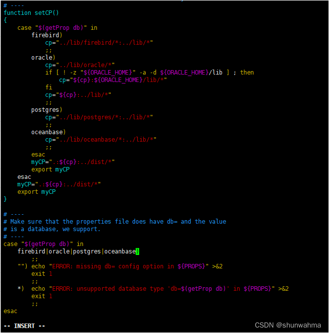 benchmarksql-5.0/run/funcs.sh,添加 OceanBase 数据库类型。function setCP() { case "$(getProp db)" in firebird) cp="../lib/firebird/*:../lib/*" ;; oracle) cp="../lib/oracle/*" if [ ! -z "${ORACLE_HOME}" -a -d ${ORACLE_HOME}/lib ] ; then cp="${cp}:${ORACLE_HOME}/lib/*" fi cp="${cp}:../lib/*" ;; postgres) cp="../lib/postgres/*:../lib/*" ;; oceanbase) cp="../lib/oceanbase/*:../lib/*" ;; esac myCP=".:${cp}:../dist/*" export myCP } ...省略 case "$(getProp db)" in firebird|oracle|postgres|oceanbase) ;; "") echo "ERROR: missing db= config option in ${PROPS}" >&2 exit 1 ;; *) echo "ERROR: unsupported database type 'db=$(getProp db)' in ${PROPS}" >&2 exit 1 ;; esac